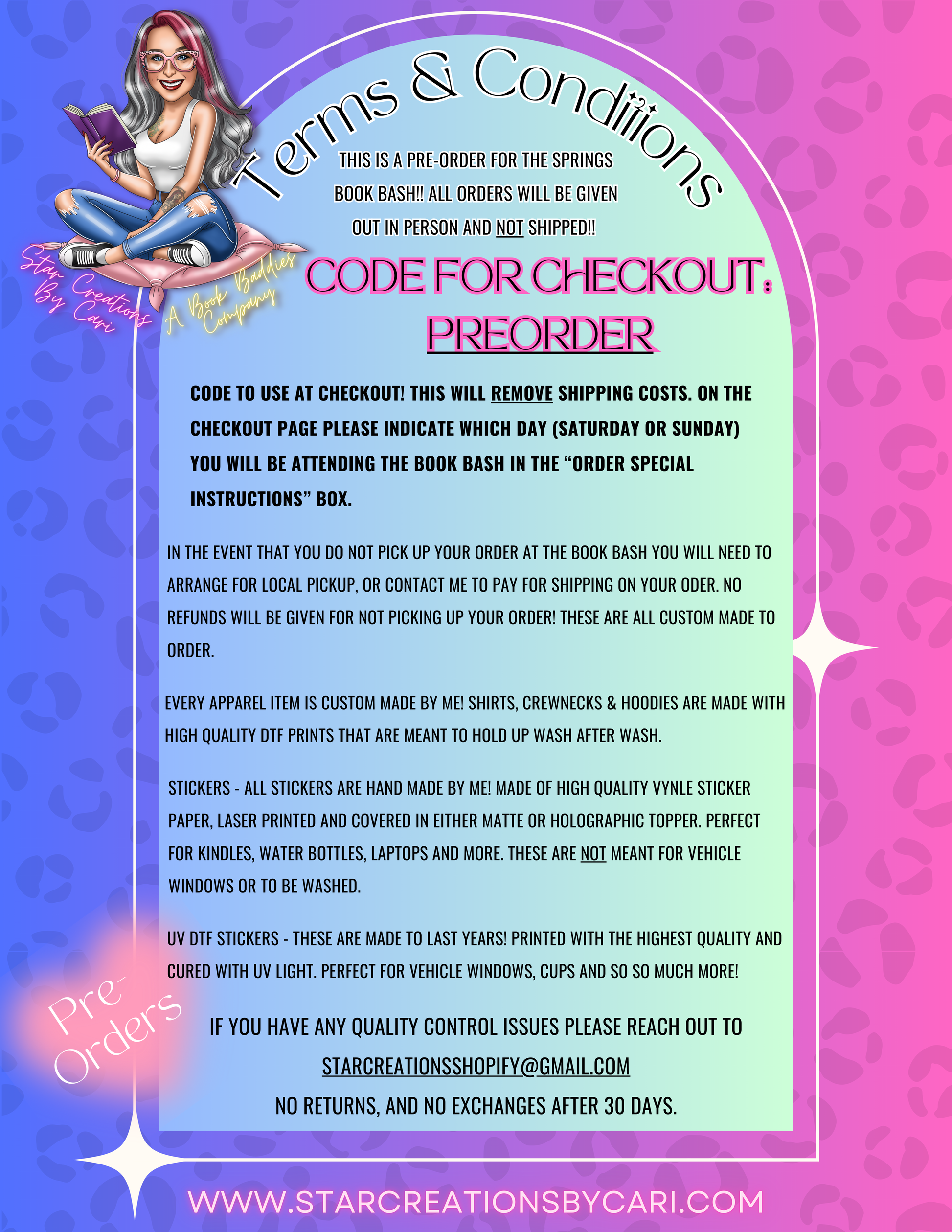 If you do not pick up your order at the book bash, you will need to arrange for local pickup or contact me to pay for shipping. No refunds will be given for not picking up your order. These are all custom made to order.